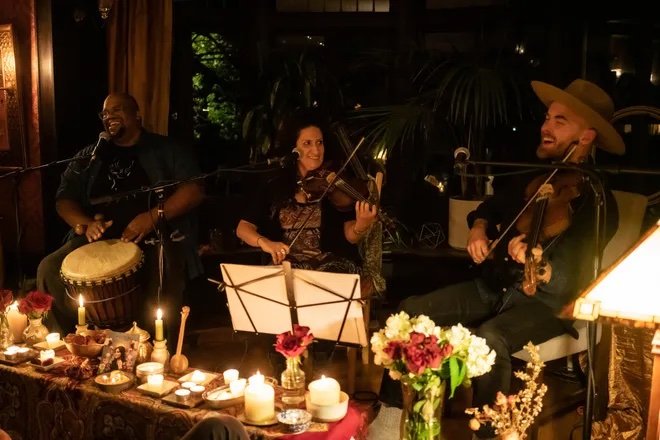 Singing The Bones is a diasporic healing project, a collaboration of 3 American artists from different ancestries sharing folk and roots music of our ancestral cultures. Kele Nitoto plays songs from the Congo, Haiti, South Africa, M’Gilvry Allen from Ireland, Scotland, and Sweden, and Lydia Violet from Iran and Armenia. As we take turns centering the music from these places, we musically support each other in arrangement and performance, creating a multi-cultural, rich performance.This engages a mix of performance and community singing, as we also teach some of these root songs to the audience, facilitating community music-making in a supportive, accessible environment.